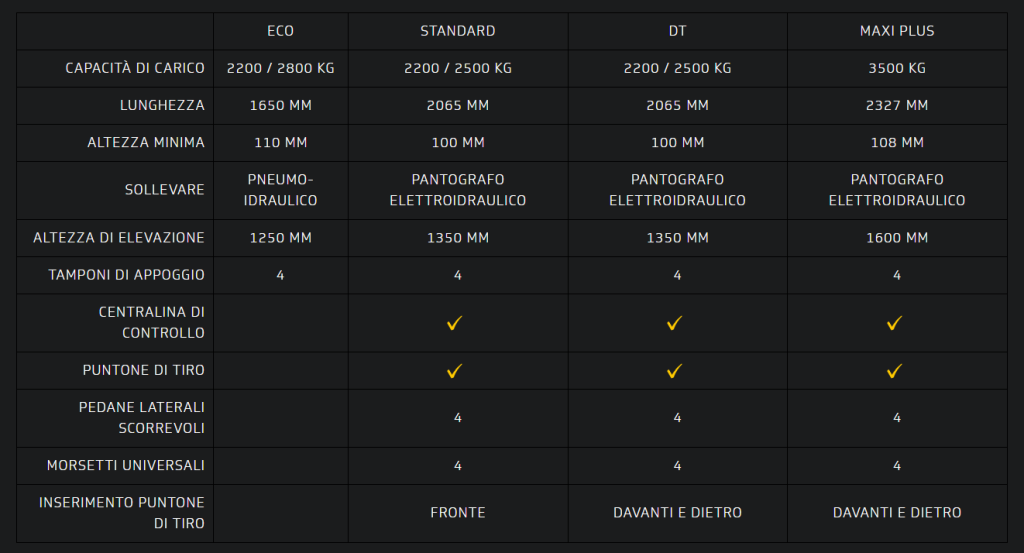 | Sollevare | Pneumo-idraulico | Pantografo elettroidraulico | Pantografo elettroidraulico | Pantografo elettroidraulico |